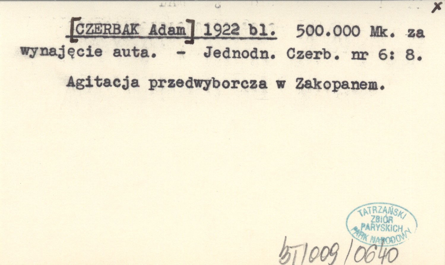 [CZERBAK Adam] 1922 bl 500.000 Mk. za wynajęcie auta.