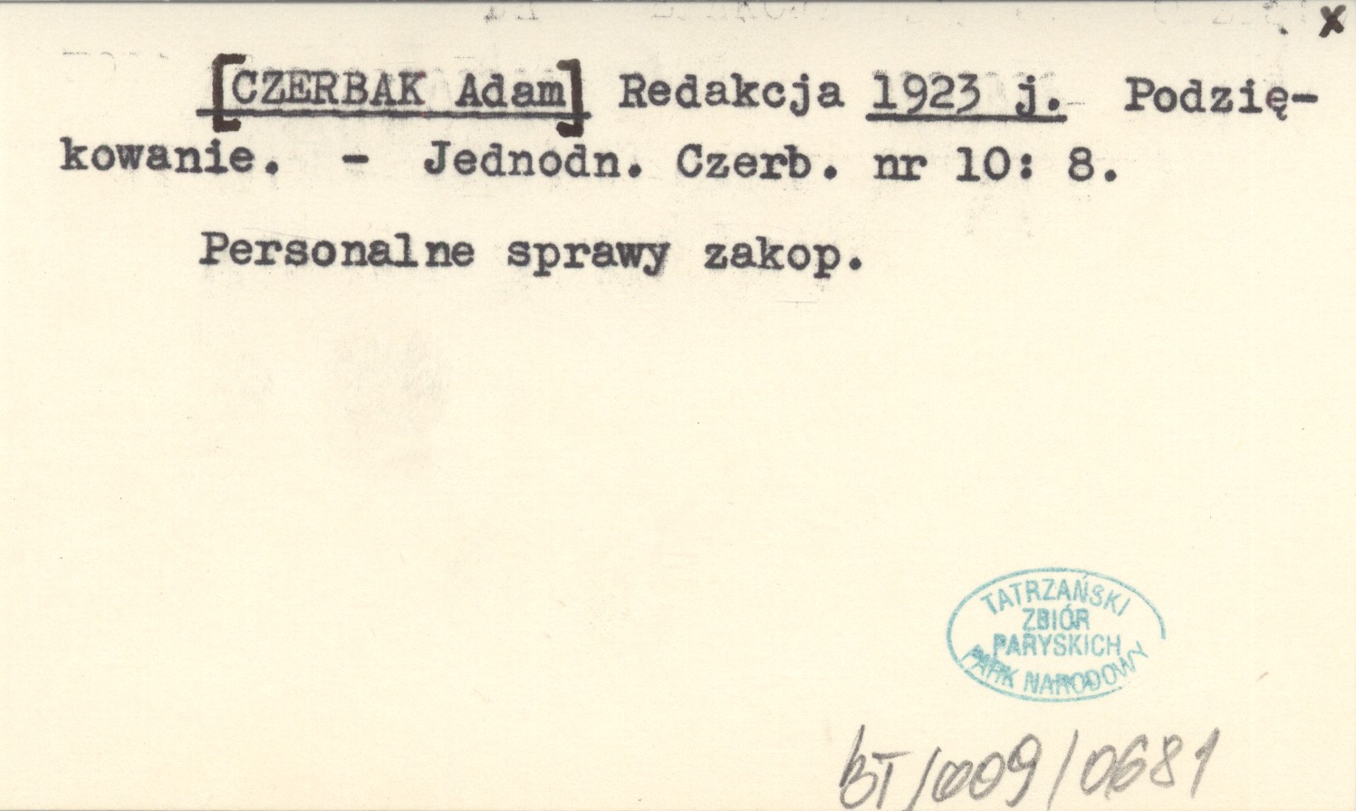 [CZERBAK Adam] RED: CZERBAK, Adam. ; 1923 j Podziękowanie.