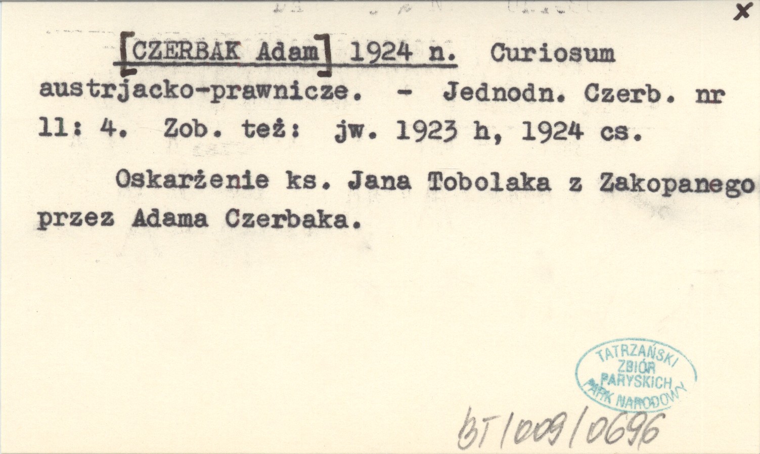 Jednodniówka Czerbaka, Nr 11: 4. Oskarżenie ks. Jana Tobolaka z Zakopanego przez Adama Czerbaka. Zob. też: jw. 1923 h, 1924 cs.