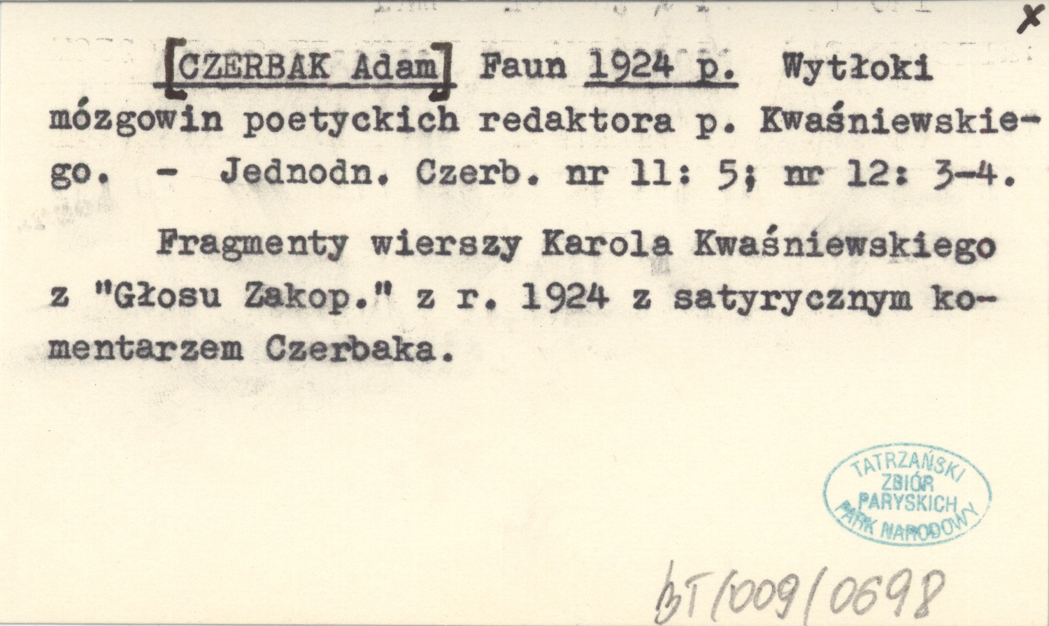 Jednodniówka Czerbaka, Nr 11: 5; nr 12: 3-4. Fragment wierszy Karola Kwaśniewskiego z "Głosu Zakopiańskiego" z r. 1924 z satyrycznym komentarzem Czerbaka.