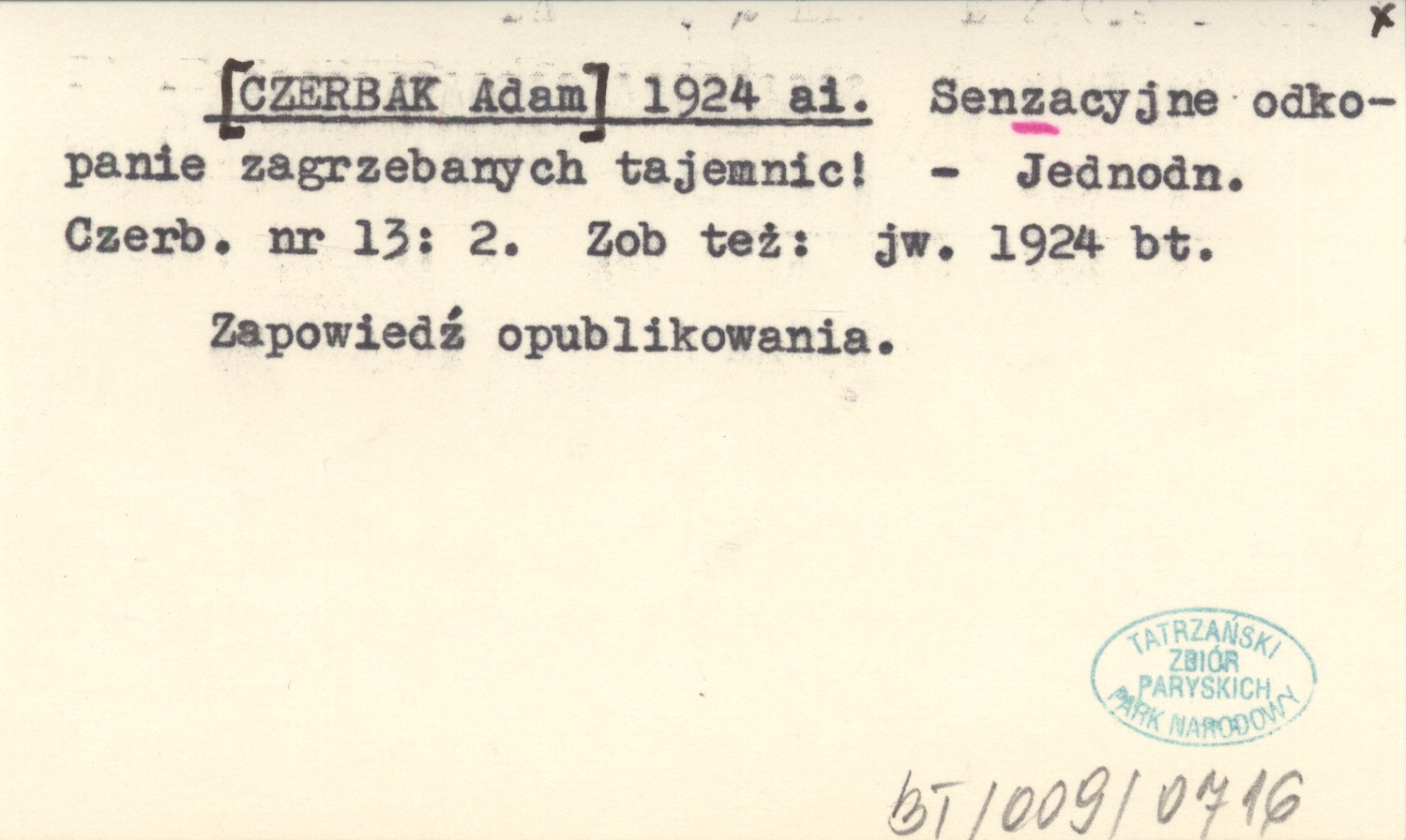 Jednodniówka Czerbaka, Nr 13: 2. Zapowiedź opublikowania. Zob. też: jw. 1924 bt.