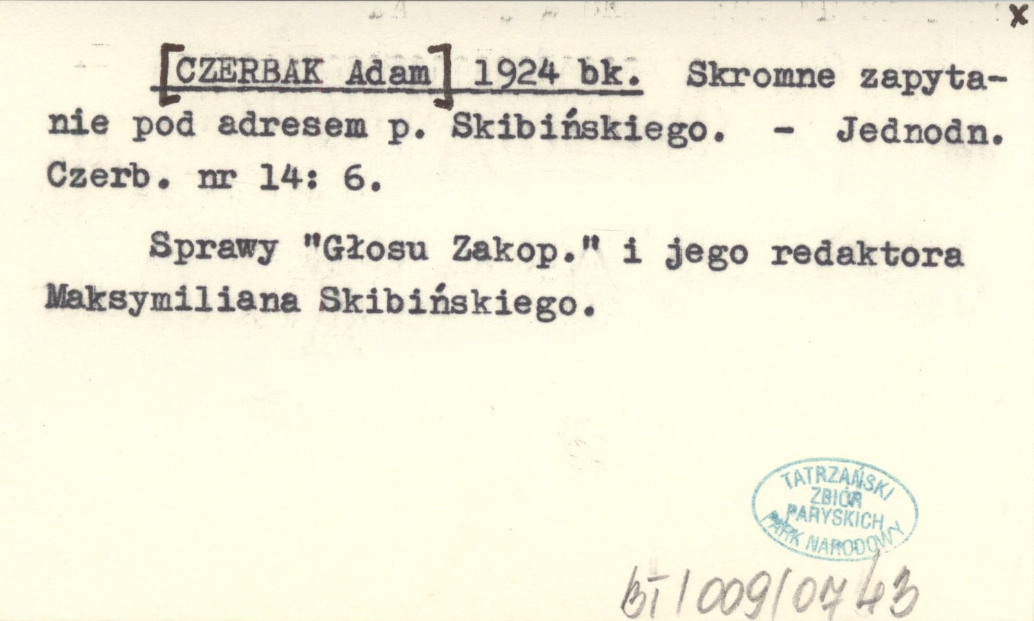 [CZERBAK Adam] 1924 bk Skromne zapytanie pod adresem p. Skibińskiego.