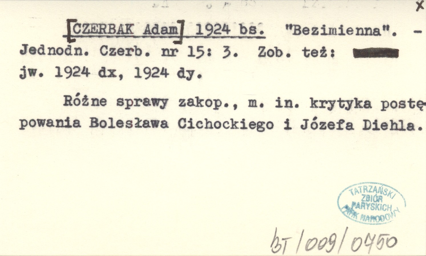 Jednodniówka Czerbaka, Nr 15: 3. Różne sprawy zakopiańskie, m. in. krytyka postępowania Bolesława Cichockiego i Józefa Diehla. Zob. też: jw. 1924 dx, 1924 dy.
