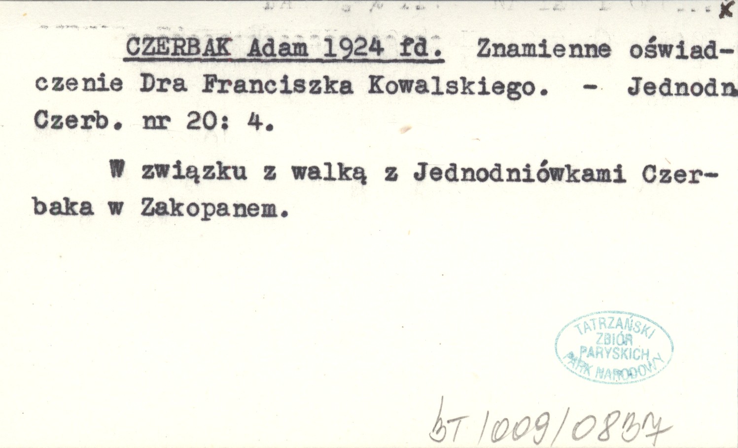 CZERBAK Adam 1924 fd Znamienne oświadczenie Dra Franciszka Kowalskiego.