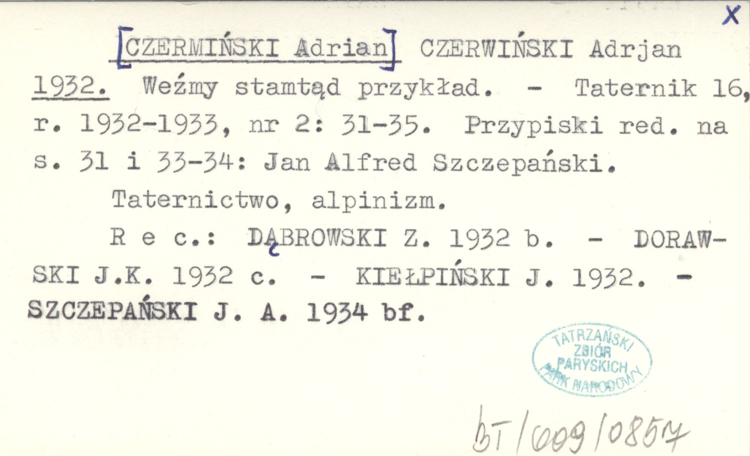 Taternik, 16, r. 1932-1933, nr 2: 31-35. Taternictwo, alpinizm. Przypiski red. na s. 31 i 33-34: Jan Alfred Szczepański. REC: DĄBROWSKI Z. 1932 b. DORAWSKI J.K. 1932 c. KIEŁPIŃSKI J. 1932. SZCZEPAŃSKI J.A. 1934 bf.