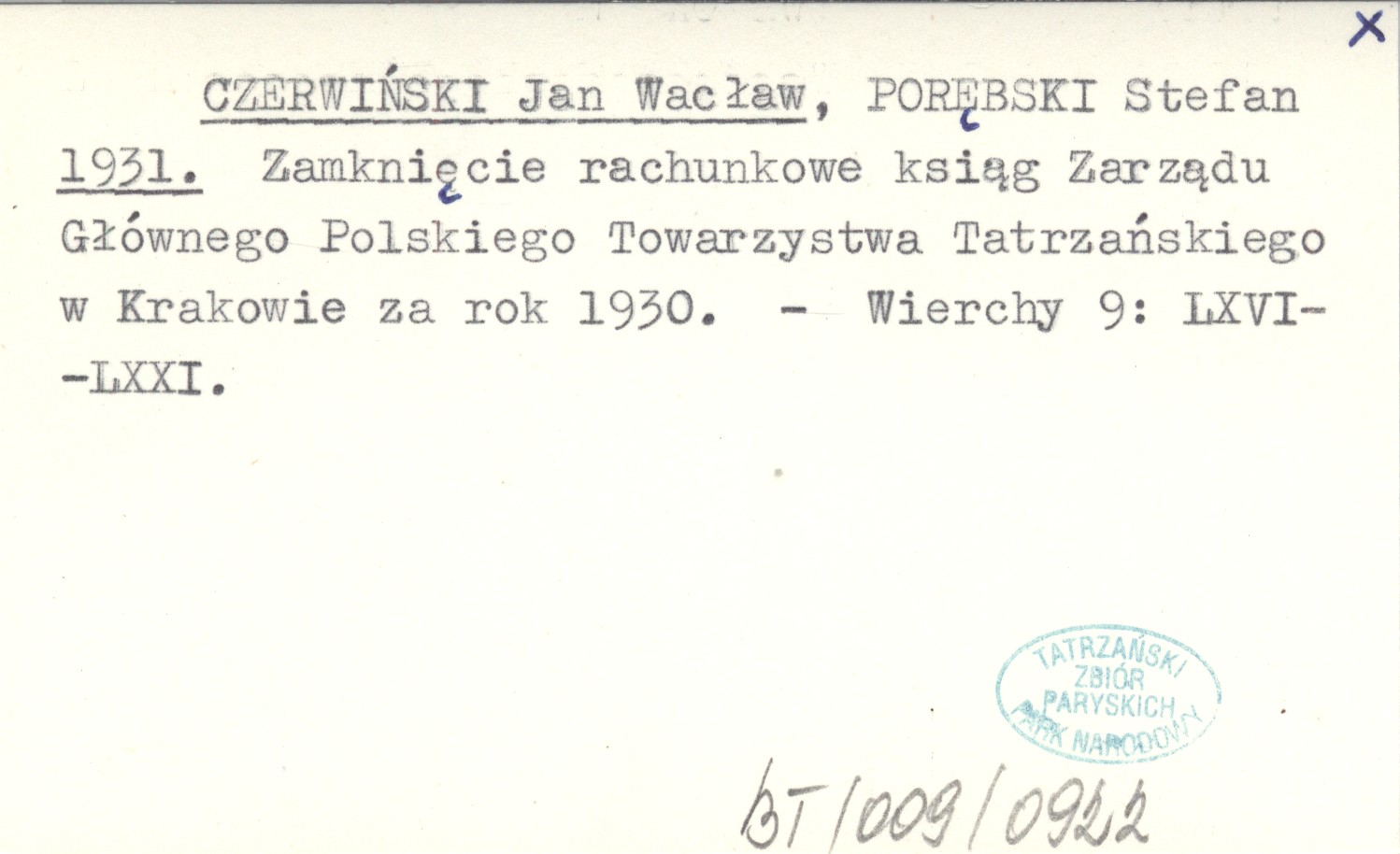 CZERWIŃSKI Jan Wacław PORĘBSKI, Stefan. ; 1931 Zamknięcie rachunkowe ksiąg Zarządu Głównego Polskiego Towarzystwa Tatrzańskiego w Krakowie za rok 1930.