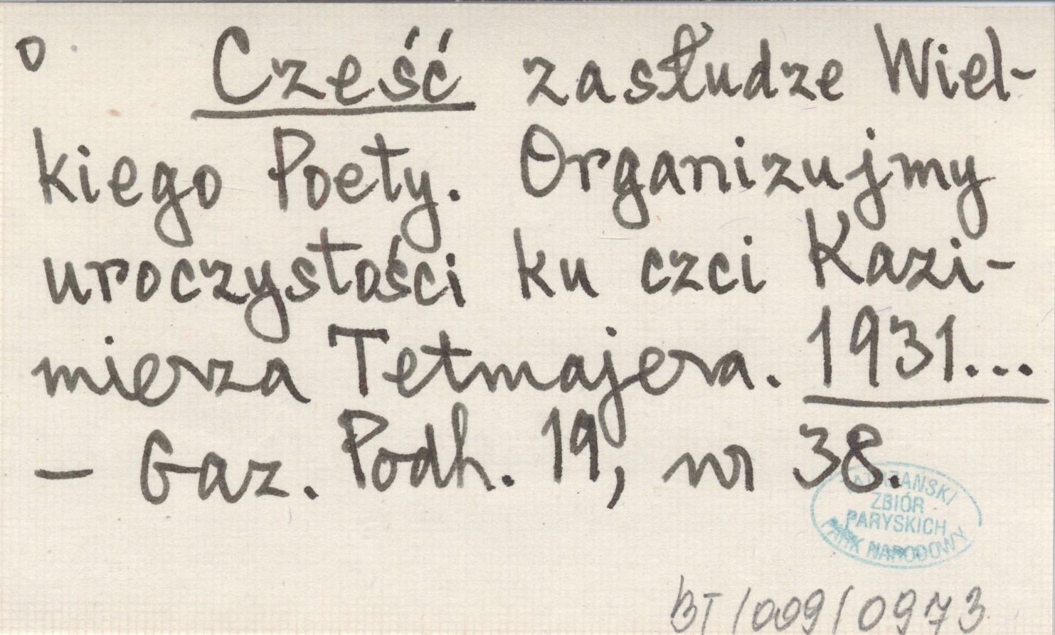 Cześć zasłudze Wielkiego Poety. Organizujmy uroczystości ku czci Kazimierza Tetmajera. 1931...