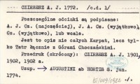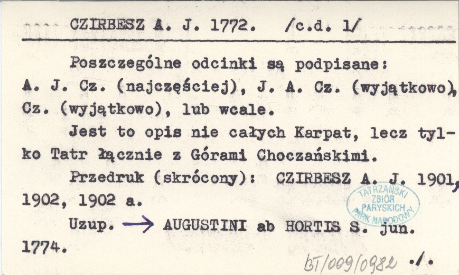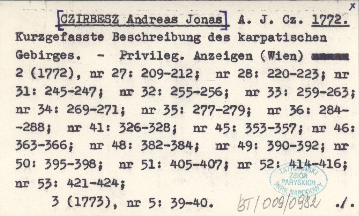 Privileg. Anzeigen (Wien) , 2 (1772), nr 27: 209-212 ; nr 28: 220-223 ; nr 31: 245-247 ; nr 32: 255-256 ; nr 33: 259-263 ; nr 34: 269-271 ; nr 35: 277-279 ; nr 36: 284-288 ; nr 41: 326-328 ; nr 45: 353-357 ; nr 46: 363-366 ; nr 48: 382-384 ; nr 49: 390-392 ; nr 50: 395-398 ; nr 51: 405-407 ; nr 52: 414-416 ; nr 53: 421-424 ; 3 (1773), nr 5: 39-40. Jest to opis nie całych Karpat, lecz tylko Tatr łącznie z Górami Choczańskimi. Poszczególne odcinki są podpisane: A. J. Cz. (najczęściej), J. A. Cz. (wyjątkowo), Cz. (wyjątkowo), lub wcale. Przedruk (skrócony): CZIRBESZ A. J. 1901, 1902, 1902 a. Uzup.: AUGUSTINI ab HORTIS S. jun. 1774. REC: CZIRBESZ A. J. 1773 (sprost. i uzup.). TERSZTYANSZKY D. 1772.