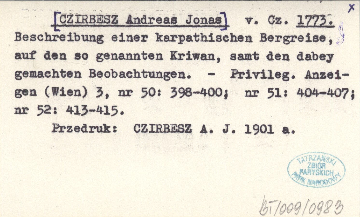 Cz. [CZIRBESZ Andreas Jonas] 1773 Beschreibung einer karpatischen Bergreise, auf den so genannten Kriwan, samt den dabey gemachren Beobachtungen.