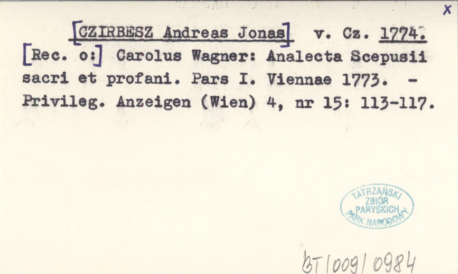 Cz. [CZIRBESZ Andreas Jonas] 1774 Carolus Wagner: Analecta Scepusii sacri et profani. Pars I. Viennae 1773.