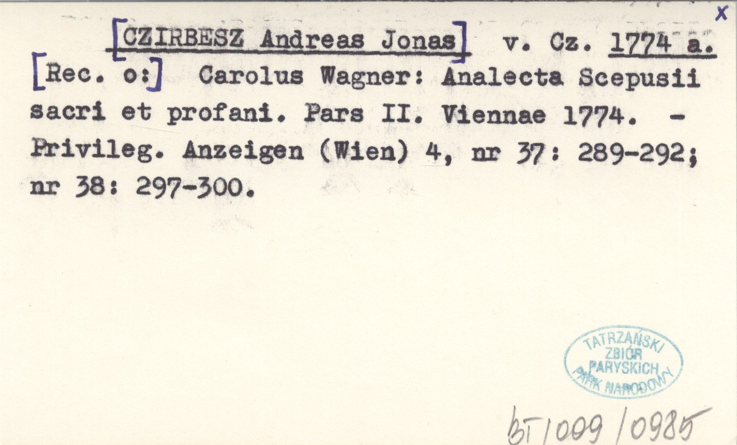 Cz. [CZIRBESZ Andreas Jonas] 1774 a Carolus Wagner: Analecta Scepusii sacri et profani. Pars II. Viennae 1774.