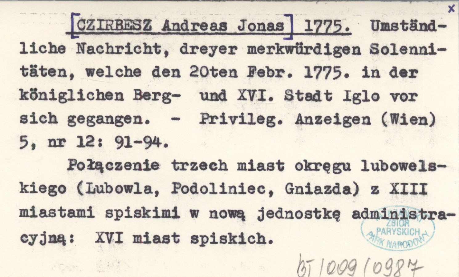 Privileg. Anzeigen (Wien) , 5, nr 12: 91-94. Połączenie trzech miast okręgu lubowelskiego (Lubowla, Podoliniec, Gniazda) z XIII miastami spiskimi w nową jednostkę administracyjną: XVI miast spiskich.