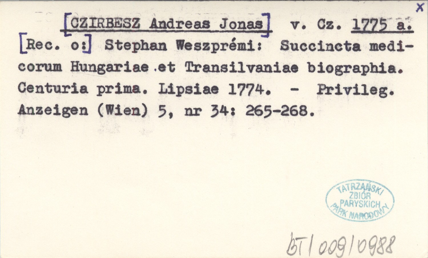 Cz. [CZIRBESZ Andreas Jonas] 1775 a Stephan Weszprémi: Succincta medicorum Hungariae et Transilvaniae biographia. Centuria prima. Lipsiae 1774.