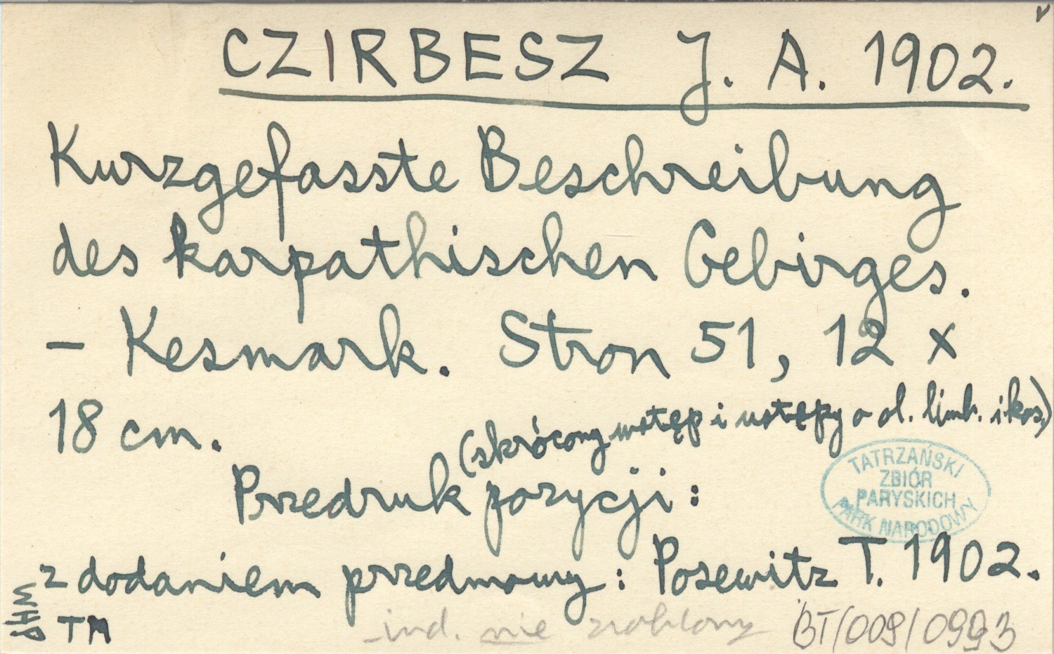 CZIRBESZ J. A. [CZIRBESZ Andreas Jonas] 1902 a Kurzgefasste Beschreibung des karpathischen Gebirges.