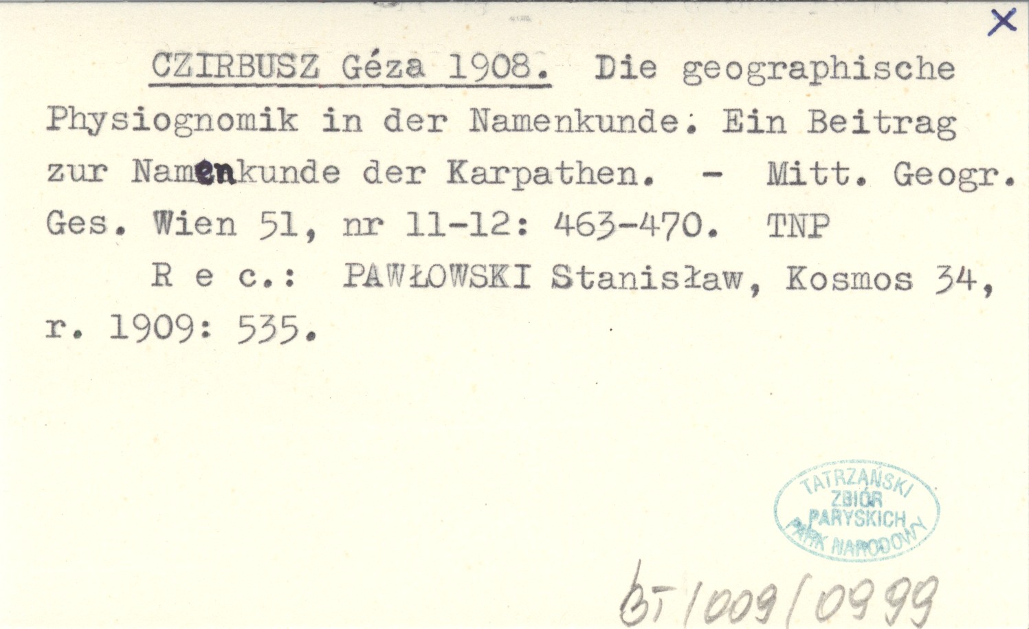 CZIRBUSZ Géza 1908 Die geographische Physiognomik in der Namekunde. Ein Beitrag zur Namenkunde der Karpathen.