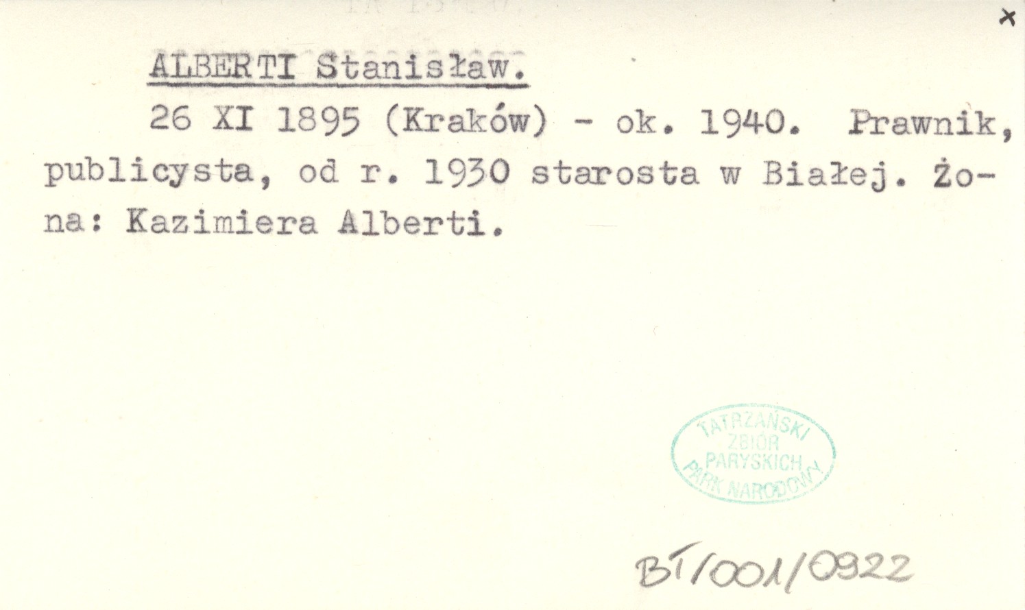 ALBERTI Stanisław. 26 XI 1895 (Kraków) - ok. 1940. Prawnik, publicysta, od r. 1930 starosta w Białej. Żona: Kazimiera Alberti.
