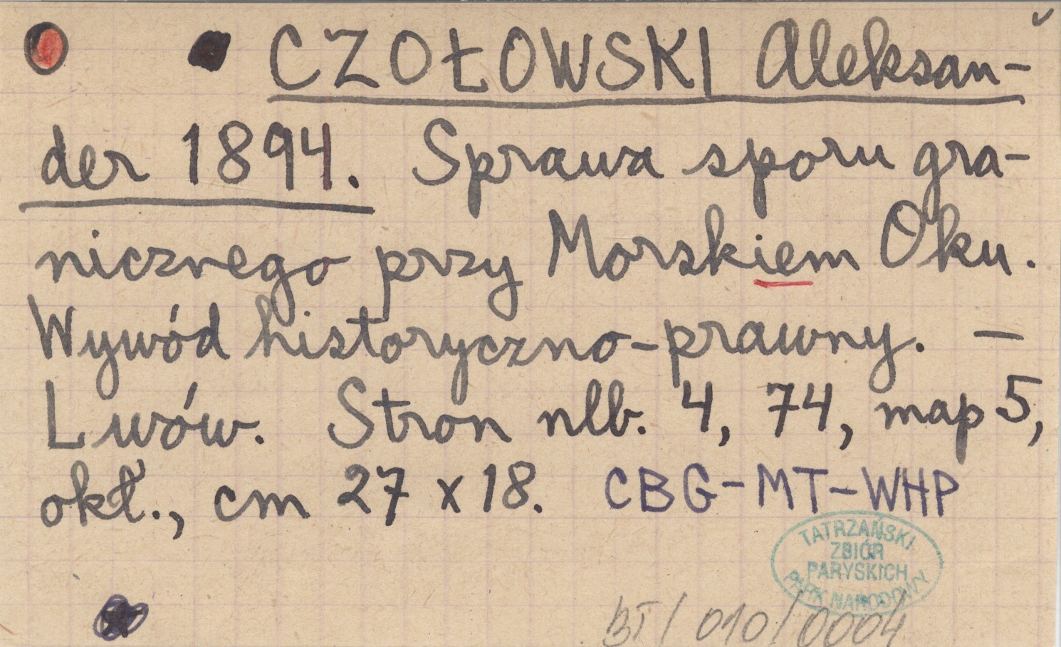 CZOŁOWSKI Aleksander 1894 Sprawa sporu granicznego przy Morskiem Oku. Wywód historyczno-prawny.