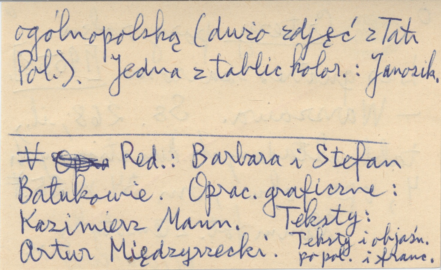 Warszawa , 268 s., il., 4 k., opr., obw., 34x25 cm. Album fotograficzny z tematyką ogólnopolską (dużo zdjęć z Tatr Polskich). Jednka z tablic kolor.: Janosik. Red.: Barbara i Stefan Bałukowie. Oprac. graficzne: Kazimierz Mann. Teksty: Artur Międzyrzecki. Teksty i objaśnienie po polski i francusku.