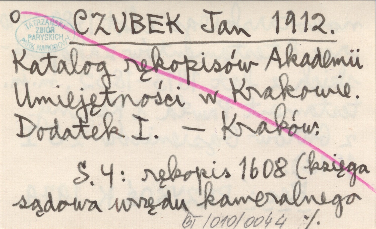 CZUBEK Jan 1912 Katalog rękopisów Akademii Umiejętności w Krakowie. Dodatek I.