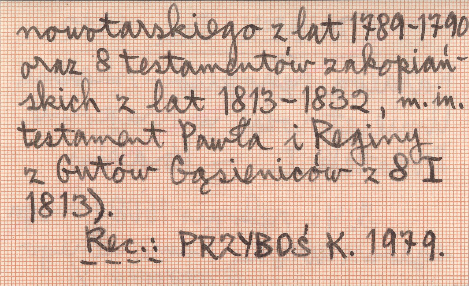 Kraków , S. 4. Rękopis s. 1608 (księga sądowa urzędu kameralnego nowotarskiego z lat 1789-1790 oraz 8 testamentów zakopiańskich z lat 1813-1832, m. in. testament Pawła i Reginy z Gutów Gąsieniców z 8 I 1813). REC: PRZYBOŚ K. 1979.