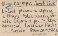 CZUPRA Jozef 1958 Ľudové piesne z Liptova a Oravy. Podľa zbierky Jozefa Czupra z pol. 19. stor. Spracoval Ladislav Galko.