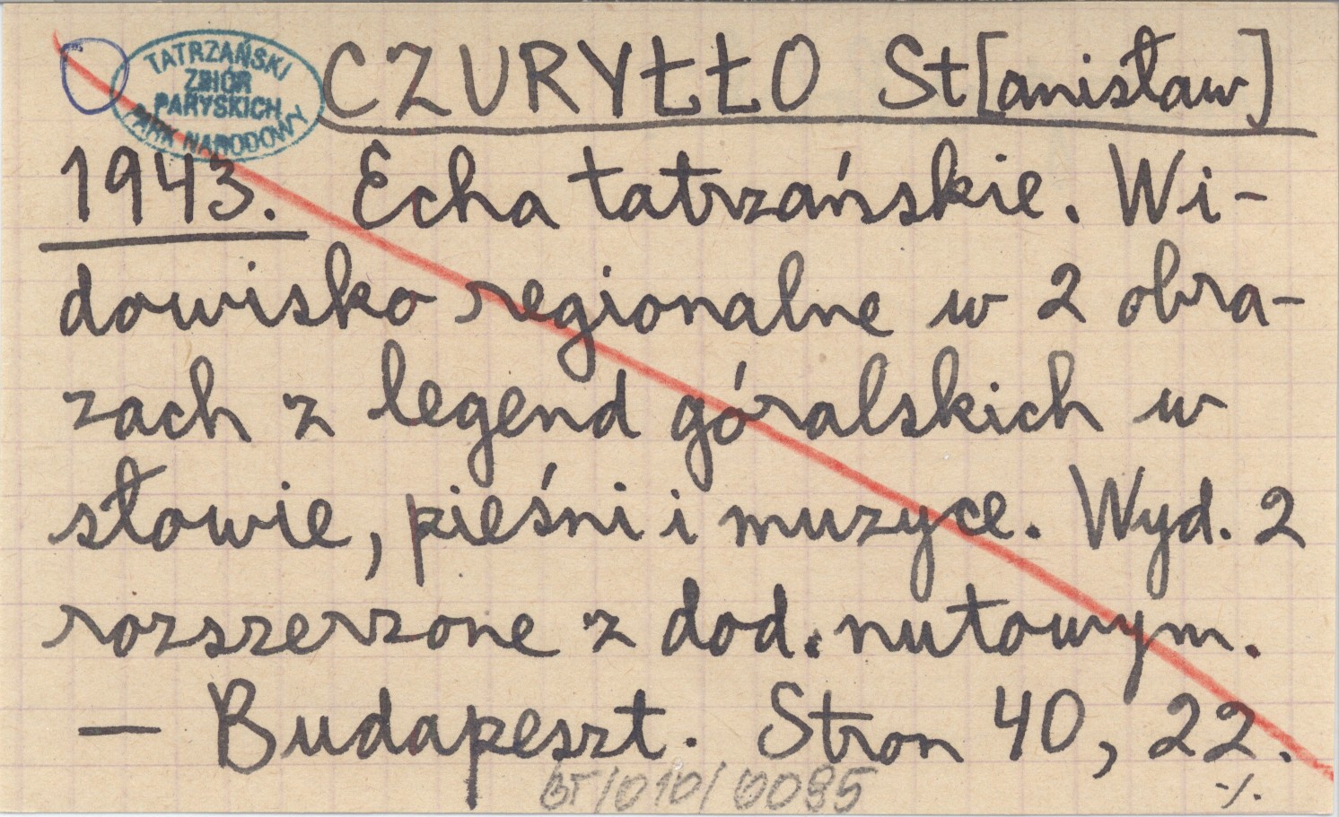 CZURYŁŁO St[anisław] 1943 Echa tatrzańskie. Widowisko regionalne w 2 obrazach z legend góralskich w słowie, pieśni i muzyce.