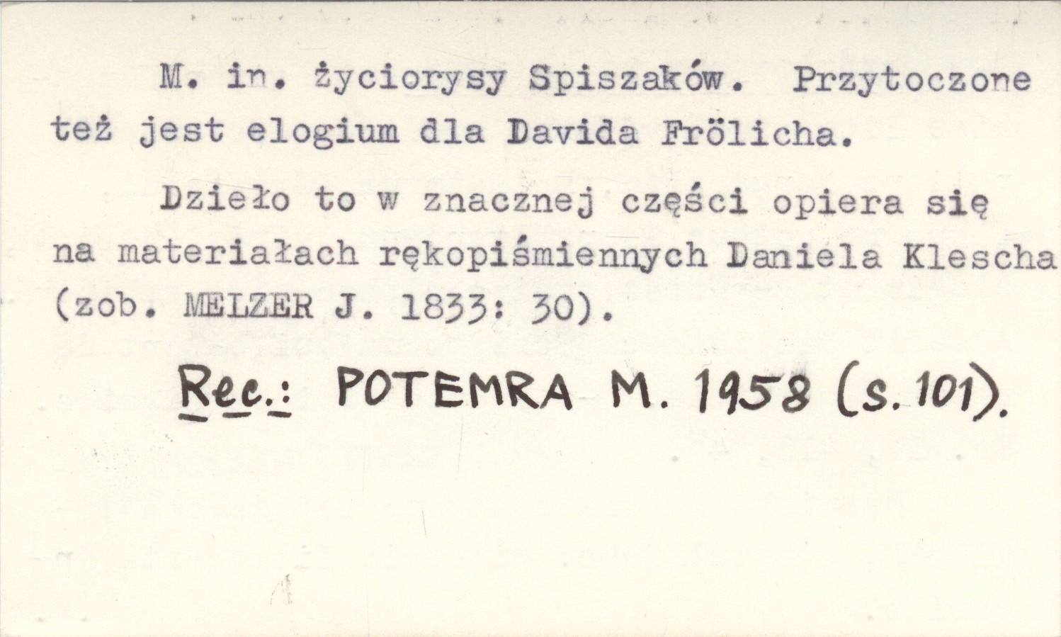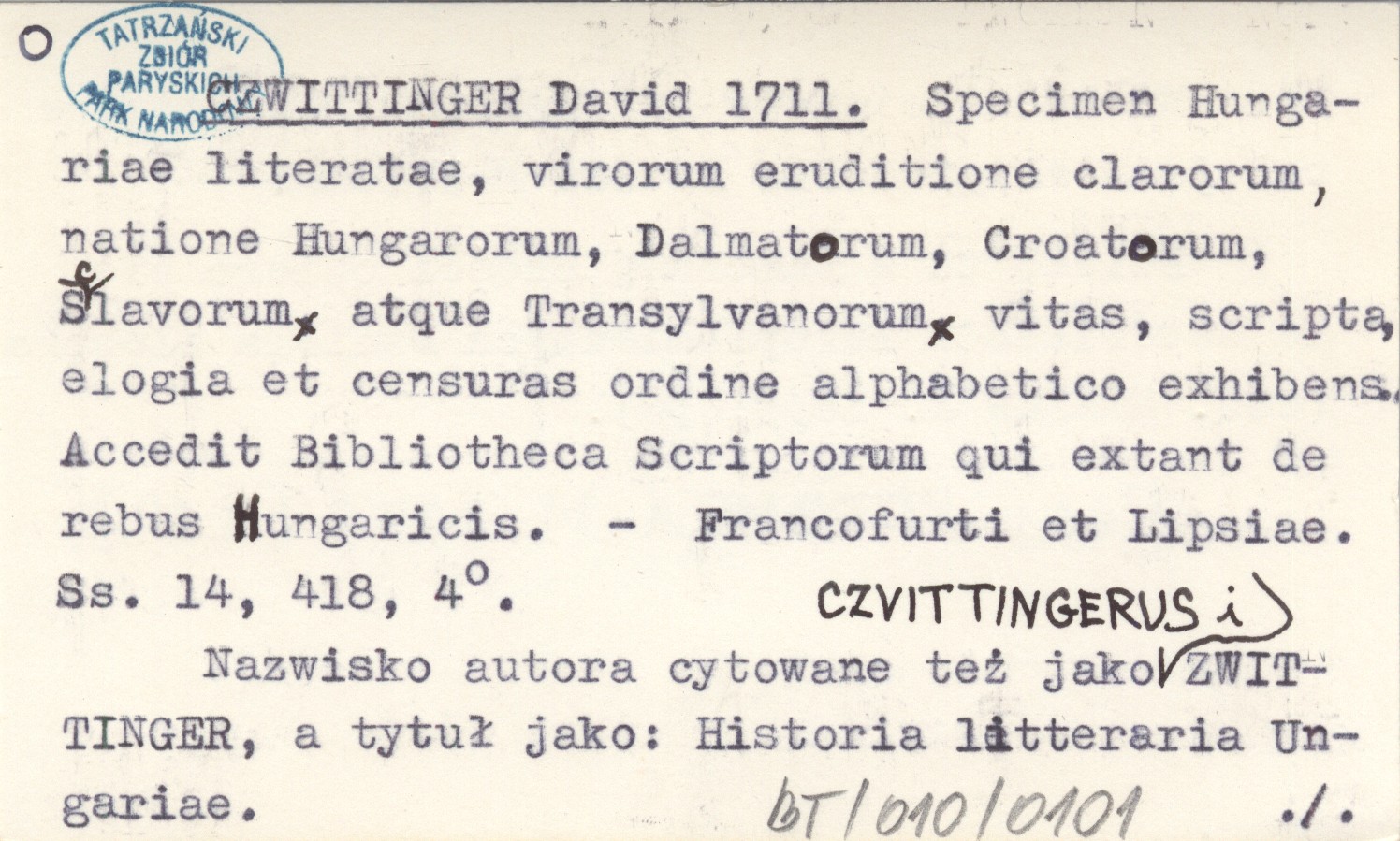 Francofurti et Lipsiae , 14, 418 s., 4°. M. in. życiorys Spiszaków. Przytoczone też jest elogium dla Davida Frölicha. Nazwisko autora cytowane też jako CZVITTINGERUS i ZWITTINGER, a tytuł jako: Historia litteraria Ungariae. Dzieło to w znacznej części opiera się na materiałach rękopiśmiennych Daniela Klescha (zob. MELZER J. 1833: 30). REC: POTEMRA M. 1958 (s. 101).