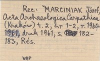 Slovenská Archeológia (Bratislava ; Nitra? ;) , 5, nr 2: 339-346, il., Zsf. REC: MARCINIAK Józef, Acta Archaeologica Carpathica (Kraków) t. 2, nr 1-2, r. 1960, druk 1961, S. 182-183, Rés.