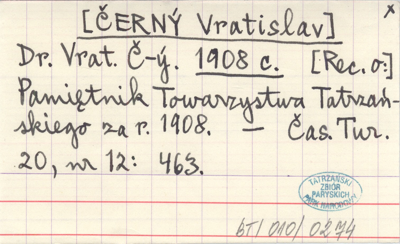 Dr. Vrat. Č-ý [ČERNÝ Vratislav] 1908 c [Rec. o:] Pamiętnik Towarzystwa Tatrzańskiego za r. 1908.
