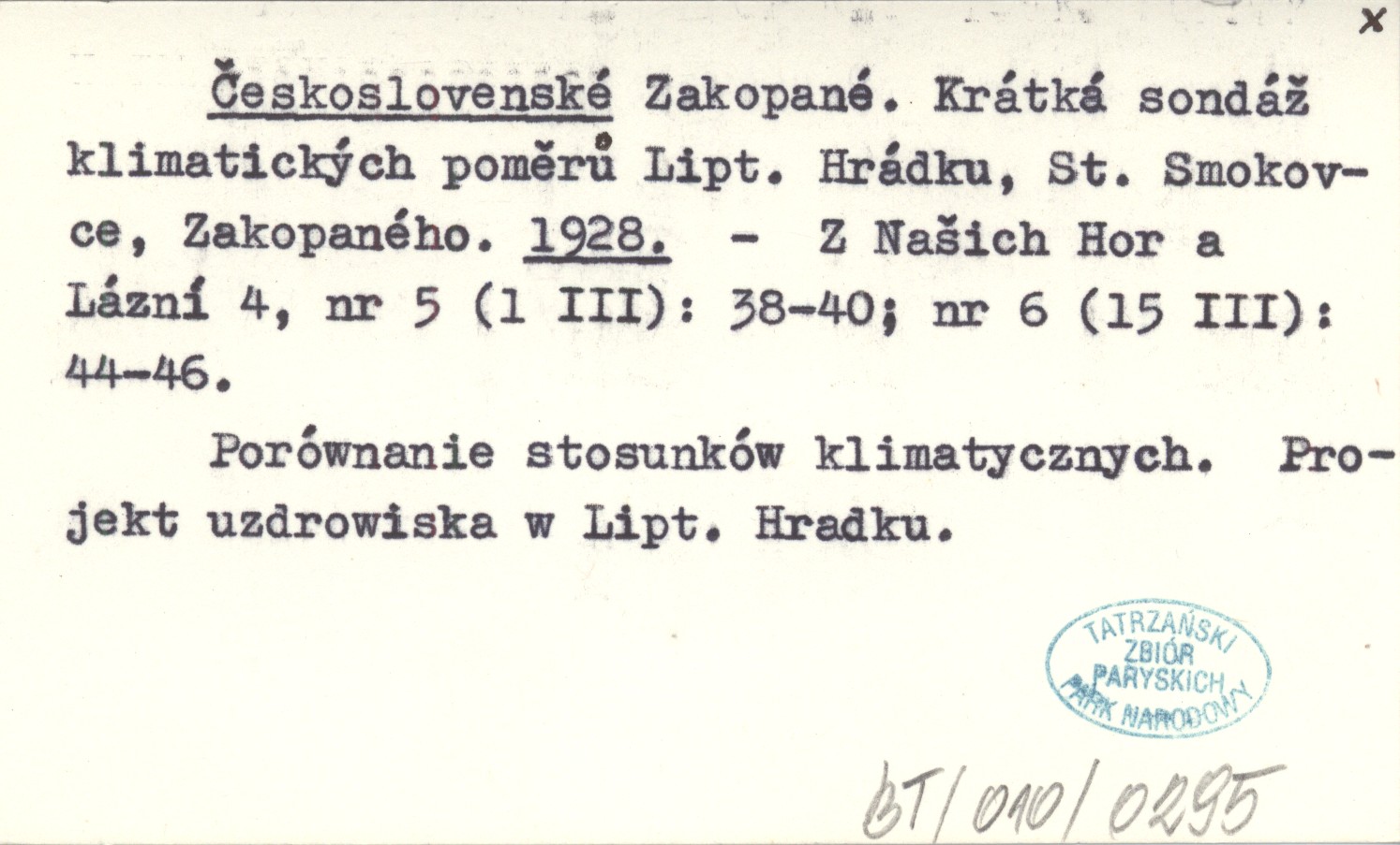 Z Našich Hor a Lázní, 4, nr 5 (1 III): 38-40 ; nr 6 (15 III): 44-46. Porównanie stosunków klimatycznych. Projekt uzdrowiska w Lipt. Hradku.