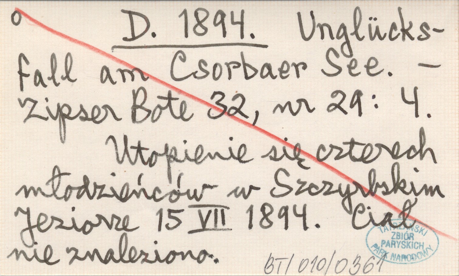 Zipser Bote, 32, nr 29: 4. Utopienie się czterech młodzieńców w Szczyrbskim Jeziorze 15 VII 1894. Ciał nie znaleziono.