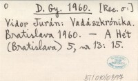 D. Gy. 1960 [Rec. o:] Vidor Jurán: Vadászkrónika. Vratislava 1960.