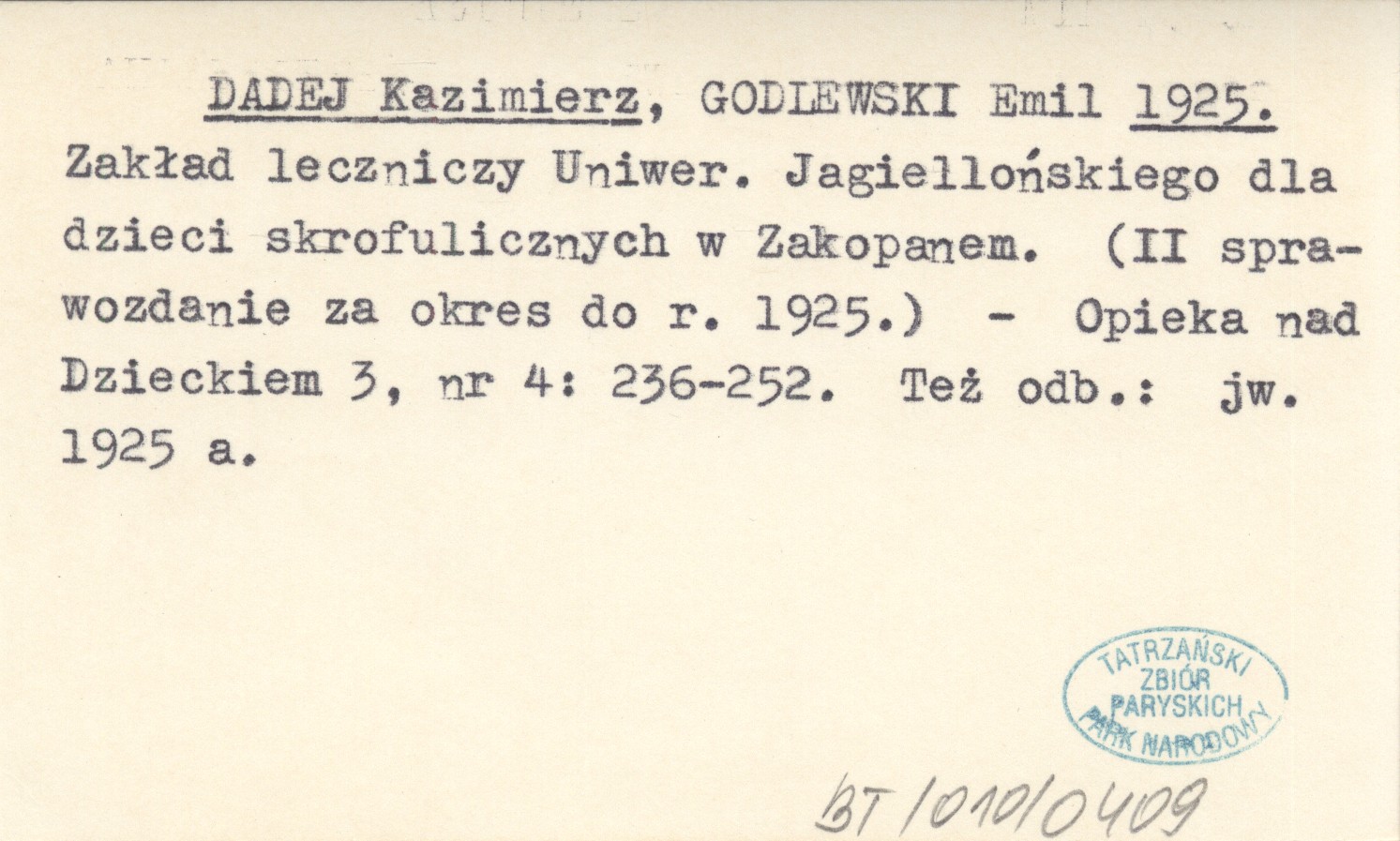 DADEJ Kazimierz GODLEWSKI, Emil. ; 1925 Zakład leczniczy Uniwersytetu Jagiellońskiego dla dzieci skrofulicznych w Zakopanem. (II sprawozdanie za okres do r. 1925).