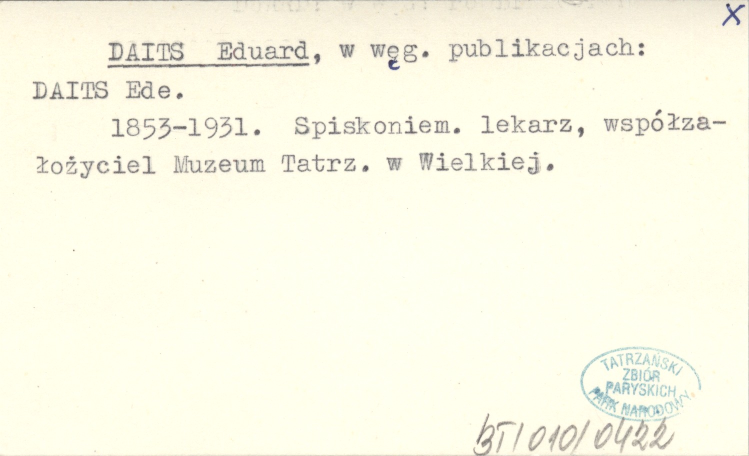 W węgierskich publikacjach: DAITS Ede. 1853-1931. Spiskoniem. lekarz, współzałożyciel Muzeum Tatrzańskiego w Wielkiej.