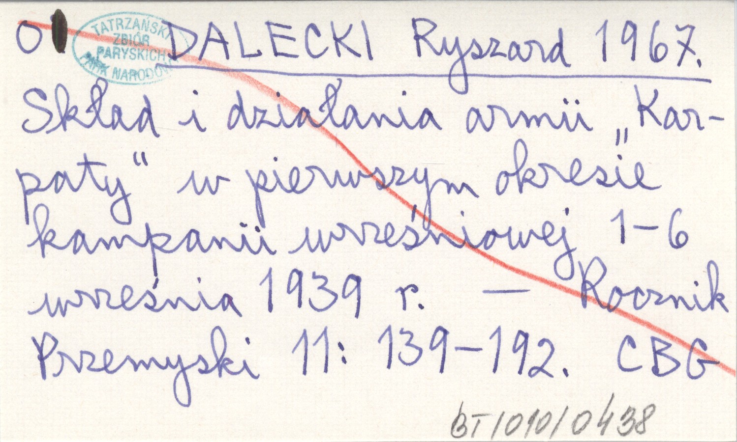 DALECKI Ryszard 1967 Skład i działania armii "Karpaty" w pierwszym okresie kampanii wrześniowej 1-6 września 1939 r.