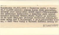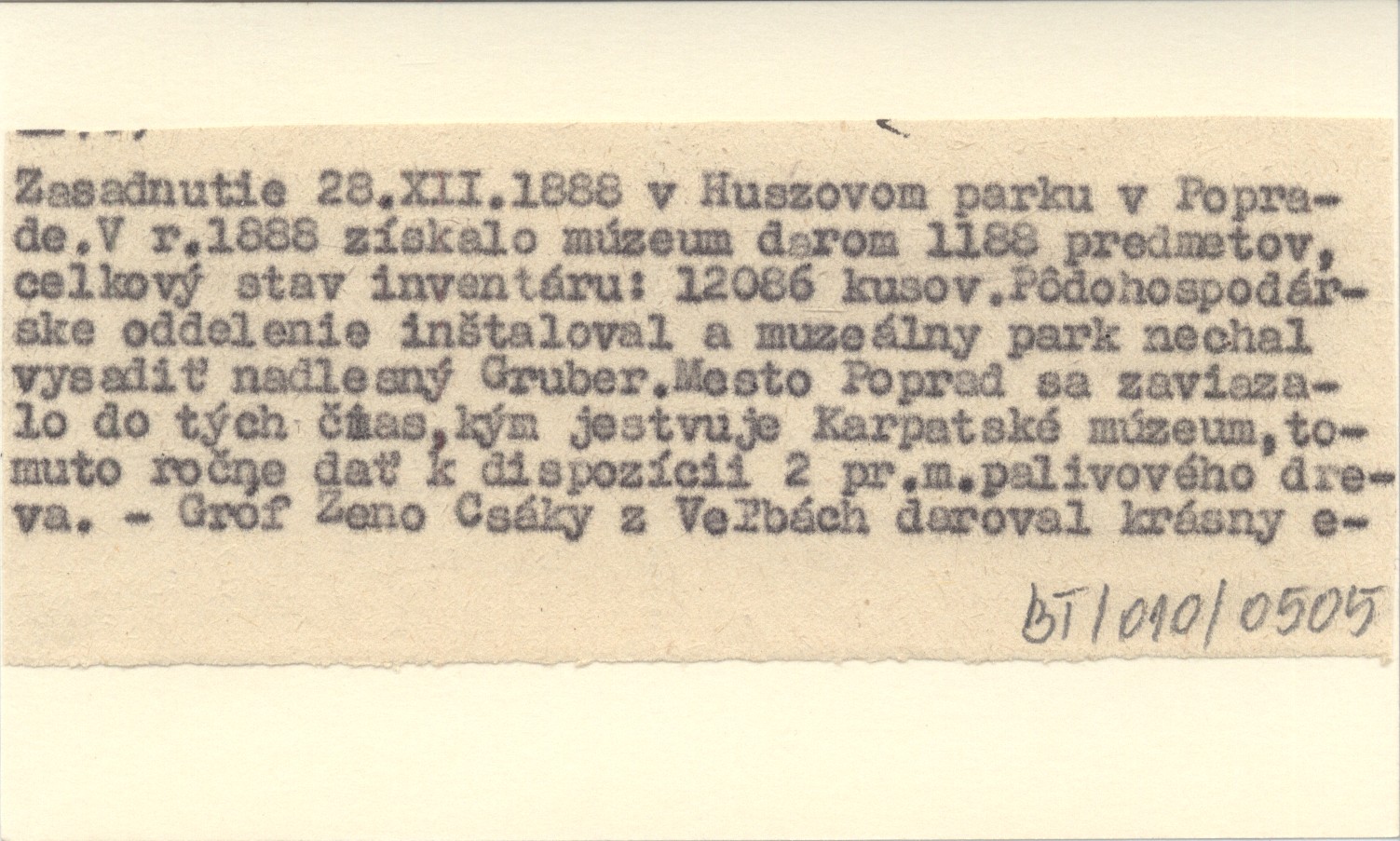 Zipser Bote, 27, nr 2: 1. Muzeum Karp. w Popradzie. Zasadnutie 28.XII.1888 v Huszovom parku v Poprade. V r. 1888 získalo múzeum darom 1188 predmetov, celkový stav inventáru: 12086 kusov. Pôdohospodárske oddelnie inątaloval a muzeálny park nechal vysadi» madlesný Gruber. Mesto Poprad sa zaviazalo do tých čmas, kým jestvuje Karpatské múzeum, tomuto ročne da» k dispozícii 2 pr.m.palivového dreva.