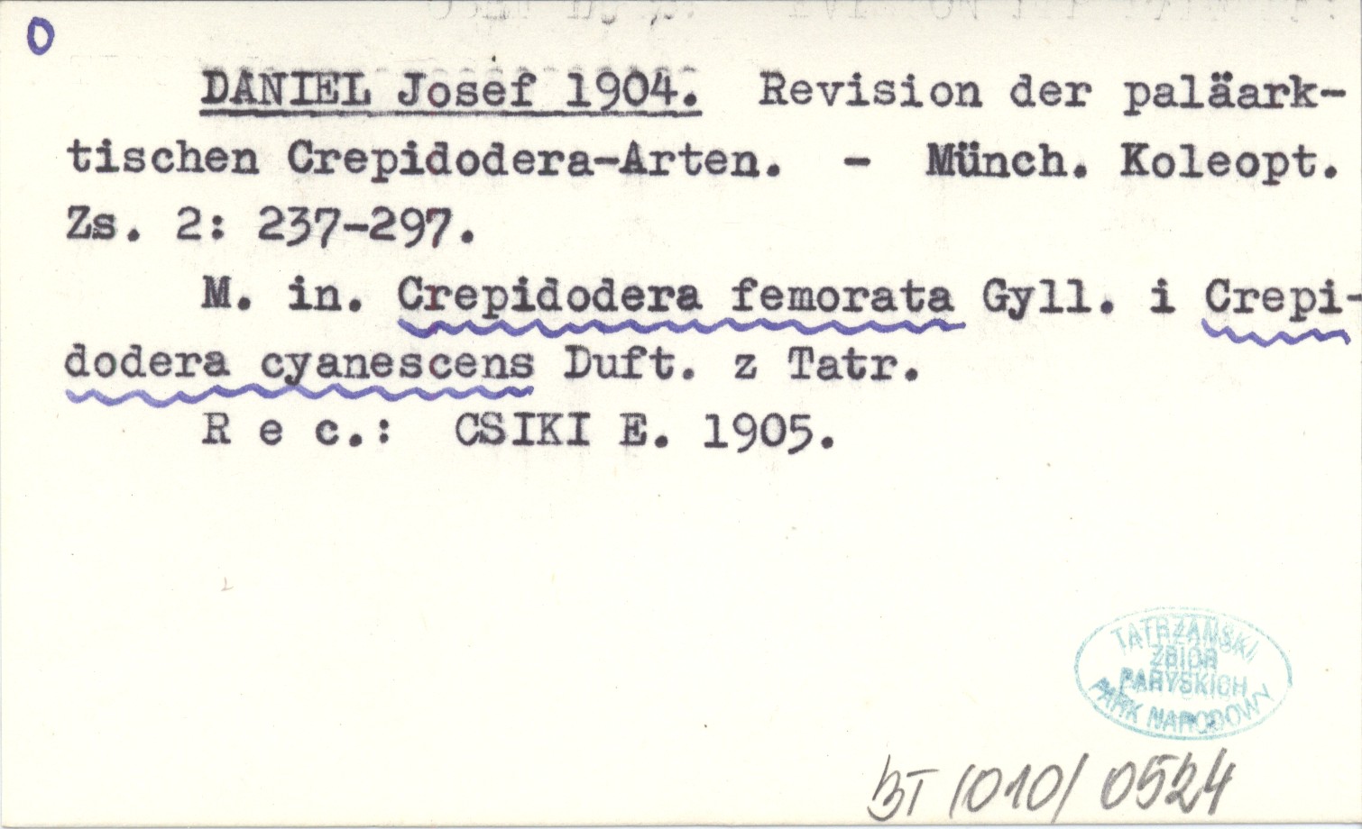 Münch. Koleopt. Zs., 2: 237-297. M. in. Crepidodera femorata Gyll. i Crepidodera cyanescens Duft. z Tatr. REC: CSIKE E. 1905.