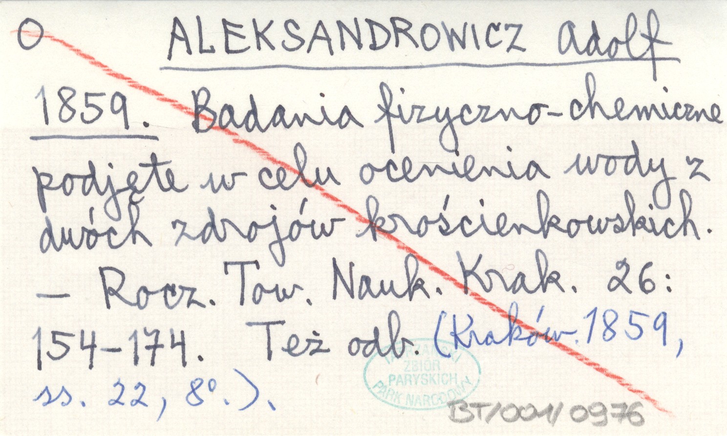 ALEKSANDROWICZ Adolf 1859 Badania fizyczno-chemiczne podjęte w celu oceniania wody z dwóch zdrojów krościenkowskich.