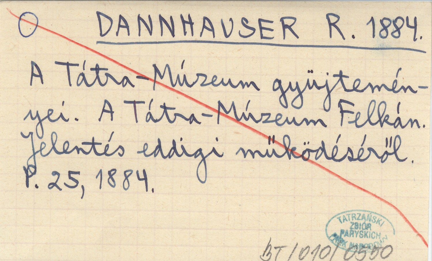 DANNHAUSER R. 1884 A Tátra-Múzeum gyüjteményei. A Tátra-Múzeum Felkán. Jelentés eddigi működéséről. P.25, 1884.