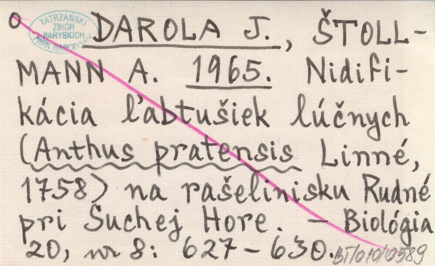 DAROLA J. ŠTOLLMANN, A. ; 1965 Nidifikácia ľabtušiek lúčnych (Anthus pratensis Linné 1758) na rašelnisku Rudné pri Suchej Hore.
