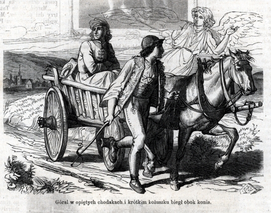 Góral w opiętych chodakach i krótkim kożuszku biegł obok konia