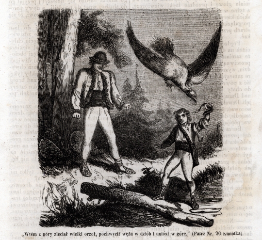 "Wtem z góry zleciał wielki orzeł, pochwycił węża w dziób i uniósł w górę."