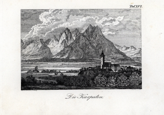 Rycina przedstawia widok z okolic Sławkowa na Łomnicę, uważaną za najwyższy szczyt w Tatrach Wysokich i otaczające ją szczyty. Na pierwszym planie Sławków. Pod ryciną podpisy : po prawej Böhme, C. C. Ryt.