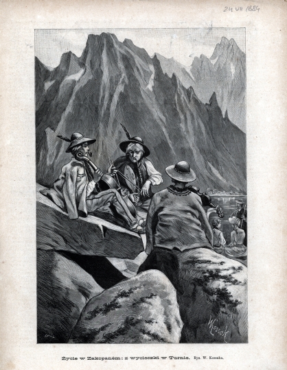 Obrazek z wycieczki tatrzańskiej w drugiej połowie XIX w. Na pierwszym planie na blokach skalnych siedzi kapela góralska złożona z trzech muzyków. Głębiej po prawej nad jeziorem dwie turystki i góral. W tle krajobraz wysokogórski. Sygnowana na płycie: E. NICZ i W. Kossak.
