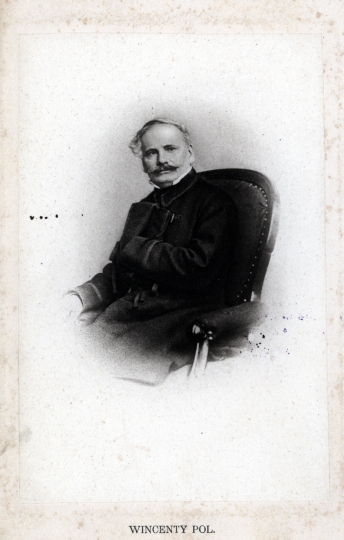 Portret Wincentego Pola. Postać siedząca, zdjęcie do kolan. Niesygnowana. Pod reprodukcją drukowany podpis i informacja: Heljograwiurę według fotografii wykonał J. Löwy w Wiedniu.