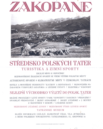 Afisz promujący walory turystyczne, sportowe, rekreacyjne i wypoczynkowe Zakopanego i polskiej części Tatr z widokiem na Zakopane i Tatry. Autora fotografii nie podano. (Zdjęcie wykonał Józef Oppenheim). Tekst w języku czeskim. Druk trójbarwny.