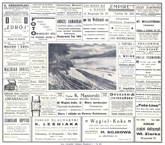 Ogłoszenia reklamowe 32 firm i zakładów usługowych działających w Zakopanem. Pośrodku fotografia, zimowy widok z Gubałówki na zasłonięte chmurami Zakopane i Tatry.