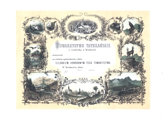 Dyplom przyjęcia na członka honorowego Towarzystwa Tatrzańskiego. Treść nominacji otacza 10 rycin przedstawiających: rzadkie gatunki zwierząt (6) - wśród nich orzeł przedni i kozica, pejzaż (3) - wśród nich widok z Tatr na otoczenie Doliny Gąsienicowej oraz ilustracja z zestawem instrumentów naukowych i książek. Ryciny zwierząt i pejzaże kolorowane. Sygnowany u dołu po lewej: Rys. i lit. M. Salb., po prawej: Zakł. litogr. M. Salba w Krakowie.