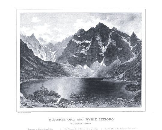 Widok Morskiego Oka i okolicznych szczytów. Na stawie tratwa z grupą turystów. W tle od lewej Niżnie Rysy, Rysy, Mięguszowieckie Szczyty, Cubryna i Mnich. Fototypia sygnowana u dołu po lewej: Walery Eljasz, po prawej C. Angerer & G. [Göschl] ph. (zakład fotochemigraficzny - producent kliszy). Pod ramką po lewej: Rysował Walery Eljasz. Po prawej: Odbito w Drukarni "Czasu" w Krakowie. Niżej tytuł. Pod nim tytuł w języku węgierskim, niemieckim i francuskim.