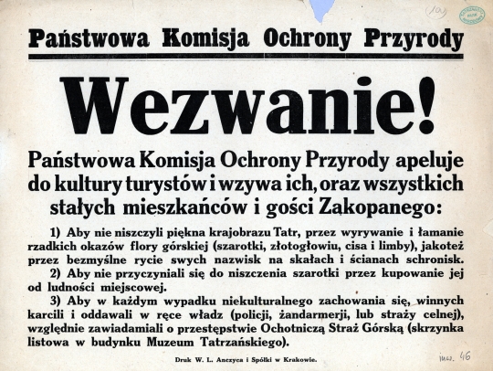Ulotka wydana przez Państwową Komisję Ochrony Przyrody wzywająca turystów oraz stałych mieszkańców i gości Zakopanego do ochrony przyrody tatrzańskiej. Szczegółowe zalecenia dotyczące ochrony krajobrazu i roślin tatrzańskich zawarto w trzech punktach.